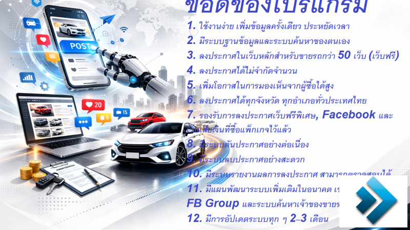 บริการโปรแกรมโพสต์ขายรถอัตโนมัติ รองรับการลงประกาศมากกว่า 50 เว็บไซต์ ไม่จำกัดจำนวนประกาศ ใช้งานง่าย ช่วยให้การทำการตลาดออนไลน์เป็นเรื่องสะดวกและรวดเร็ว เพียงกรอกข้อมูลครั้งเดียวก็สามารถกระจายประกาศได้หลายช่องทาง